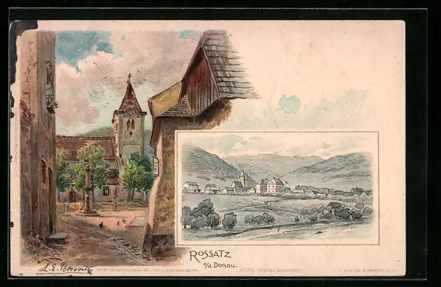 Lithographie Rossatz a / d. Donau, Teilansicht, Ortspartie mit Kirche