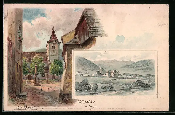 Lithographie Rossatz a / d. Donau, Teilansicht, Ortspartie mit Kirche