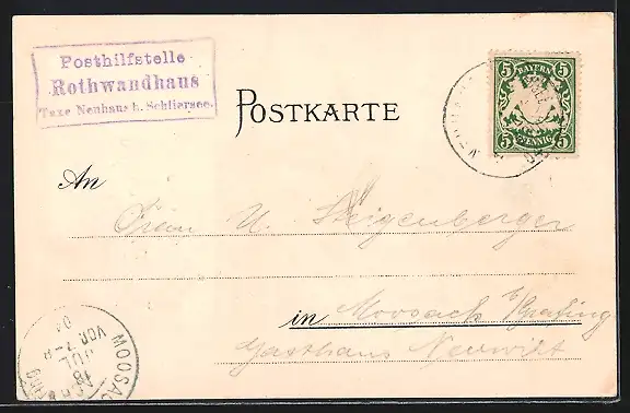 Personenbezogene Daten auf der Rückseite der Karte wurden durch blauen Textmarker unkenntlich gemacht. Die blauen Stellen sind auf die Vorderseite durchgeweicht und wirken sich negativ auf das Postkartenfoto aus