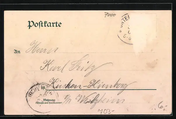 Personenbezogene Daten auf der Rückseite der Karte wurden durch blauen Textmarker unkenntlich gemacht. Die blauen Stellen sind auf die Vorderseite durchgeweicht und wirken sich negativ auf das Postkartenfoto aus