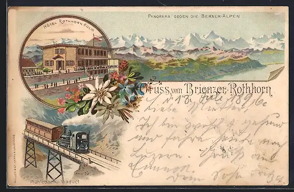 Lithographie Rothorn-Kulm, Das Hotel, Bergbahn auf dem Mühlebach-Viaduct, Panorama gegen Berner Alpen