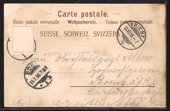 gelaufen 1896, Briefmarke entfernt, rückseitig Oberflächenschaden, guter Zustand