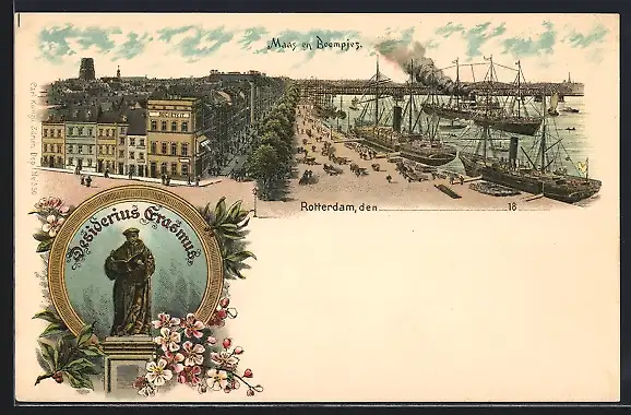 Lithographie Rotterdam, Maas en Boompjes, Desiderius Erasmus