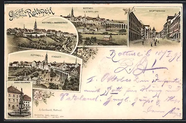 Lithographie Rottweil, Teilansicht u. Viaduct, Marktbrunnen, Hauptstrasse