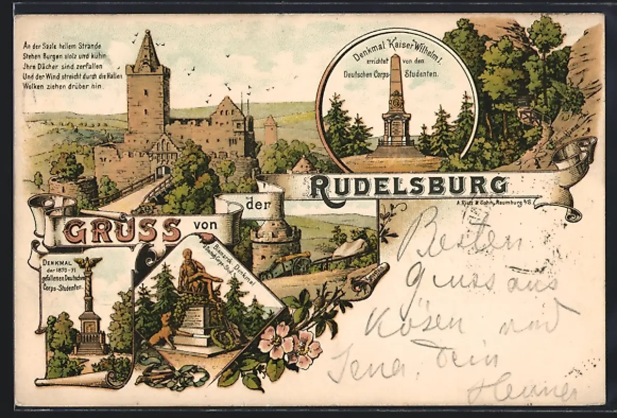 Lithographie Rudelsburg, Burganlage, Kaiser-Wilhelm-Denkmal, Denkmal Deutscher Corpsstudenten
