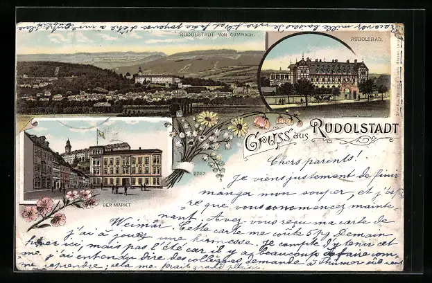 Lithographie Rudolstadt, Ortsansicht, Der Markt, Rudolsbad