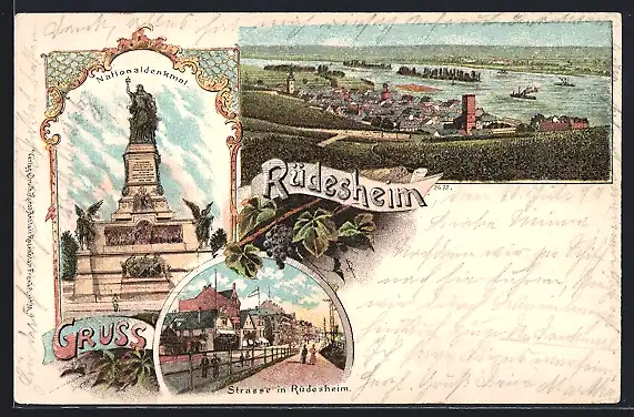 Lithographie Rüdesheim, Nationaldenkmal a. d. Niederwald, Strassenpartie, Ortsansicht mit Weinbergen