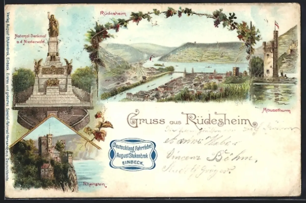 Lithographie Rüdesheim / Rhein, Niederwalddenkmal, Mäuseturm, Rheinpartie