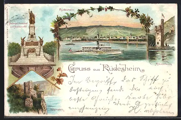 Lithographie Rüdesheim / Rhein, Panorama mit Dampfer, Burg Rheinstein
