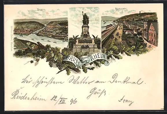Lithographie Rüdesheim / Rhein, Strassenpartie am Rheinufer, Niederwalddenkmal, Bingen