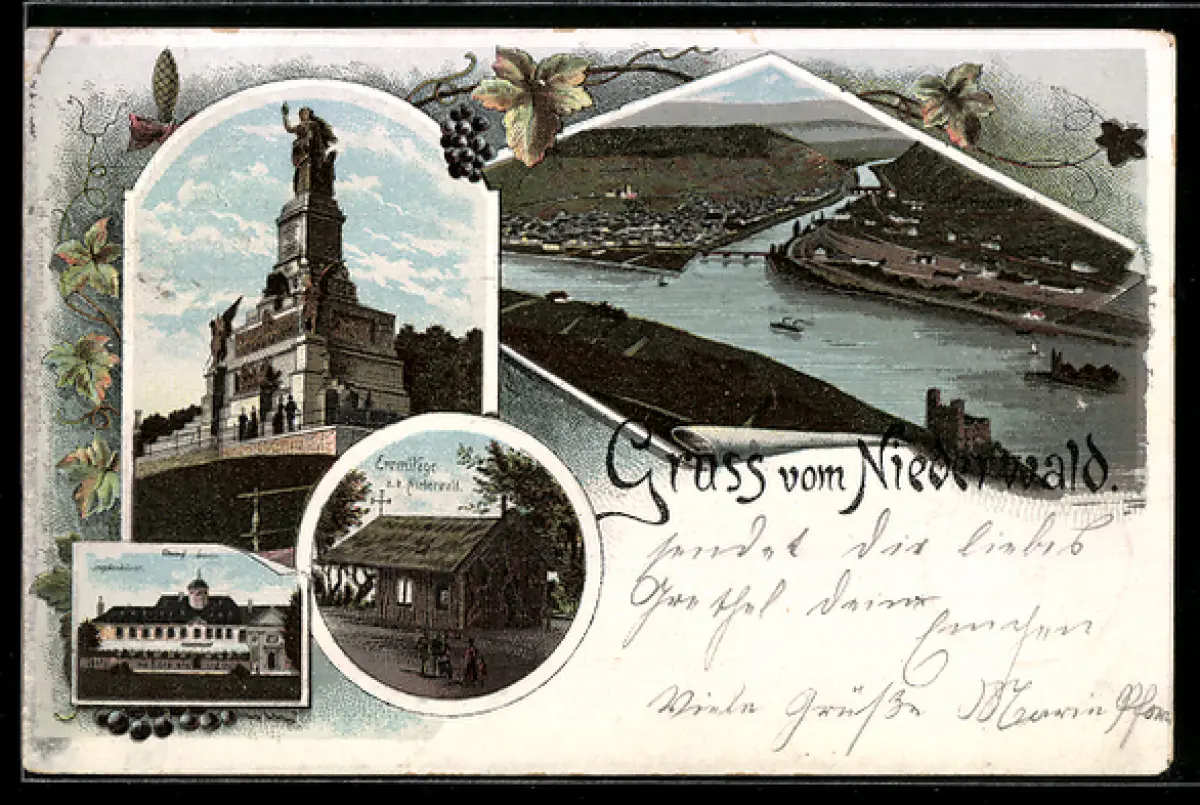 Lithographie Rüdesheim am Rhein, Eremitage, Rheinansicht, National-Denkmal