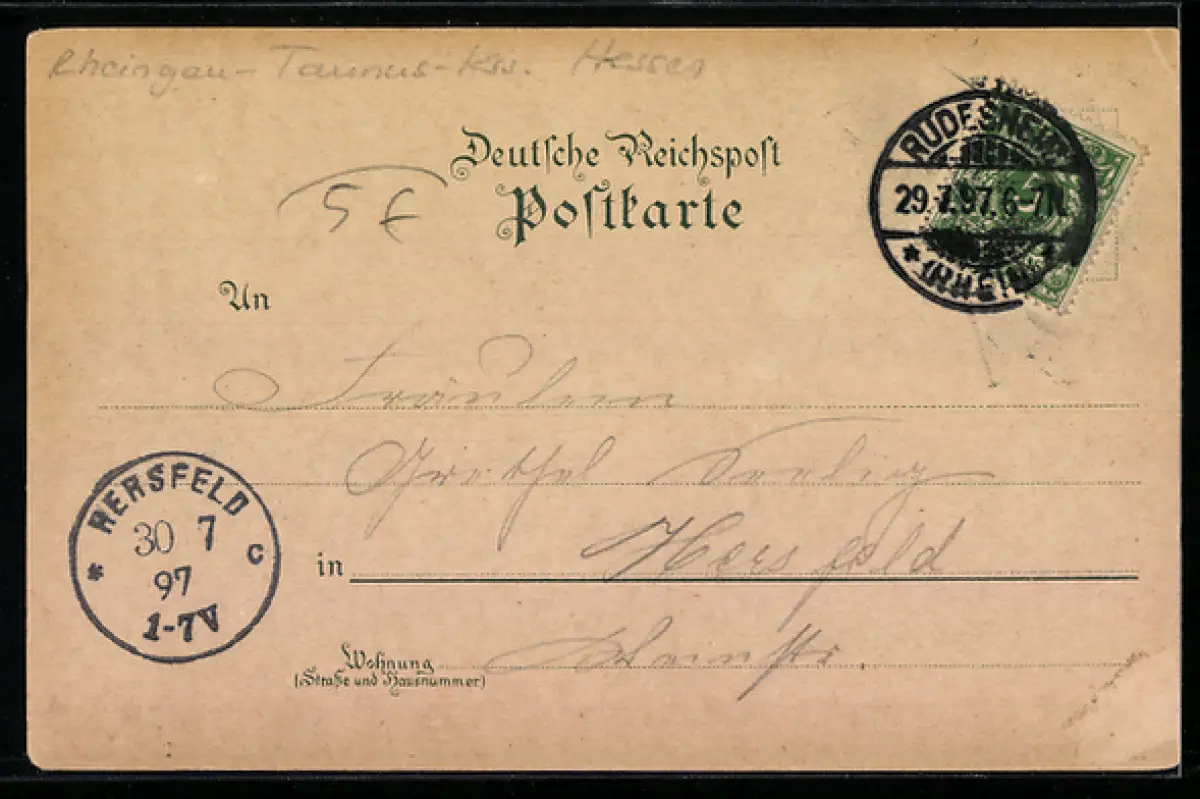 gelaufen 1897, Eckknick oben li. u. unten re., Stempelspur, guter Zustand