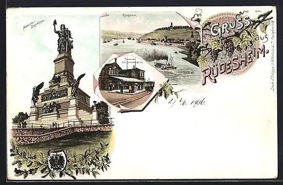 Lithographie Rüdesheim am Rhein, National-Denkmal, Ortsansicht, Bahnhof der Zahnradbahn