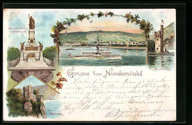 Lithographie Rüdesheim am Rhein, Nationaldenkmal a.d. Niederwald, Rheinstein, Ortsansicht mit Dampfschiff