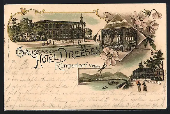 Lithographie Rüngsdorf, Hotel und Pension Dreesen, Aussen - und Innenansicht, Hotelgebäude am Rheinufer