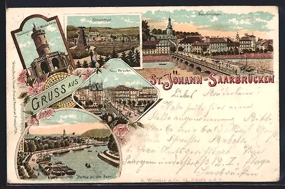 Lithographie Saarbrücken, Denkmal am Winterberg, Ehrenthal, Partie an der Saar