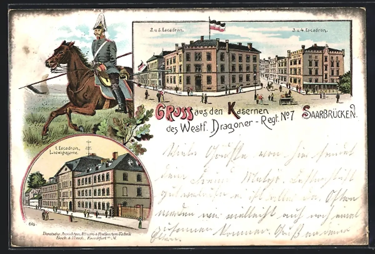 Lithographie Saarbrücken, Kasernen des Westf. Dragoner-Regiments Nr. 7, Ludwigkaserne, Dragoner mit Lanze zu Pferde
