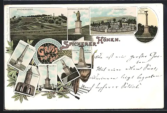 Lithographie Saarbrücken, Spicherer Höhen - Spichernberg, Denkmäler, Ehrenthal