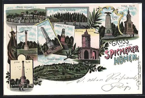 Lithographie Saarbrücken, Spicherer Höhen, Winterberg Denkmal, Denkmäler Reg. 77, Reg. 40 und Reg. 30