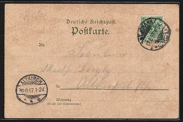 Personenbezogene Daten auf der Rückseite der Karte wurden durch blauen Textmarker unkenntlich gemacht. Die blauen Stellen sind auf die Vorderseite durchgeweicht und wirken sich negativ auf das Postkartenfoto aus