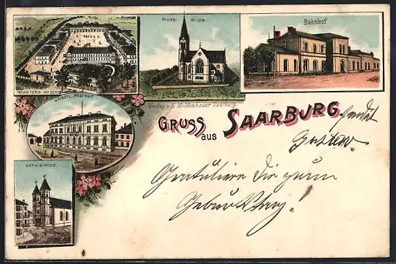 Lithographie Saarburg, kath. Kirche, Kaiserl. Postamt, prot. Kirche, Bahnhof