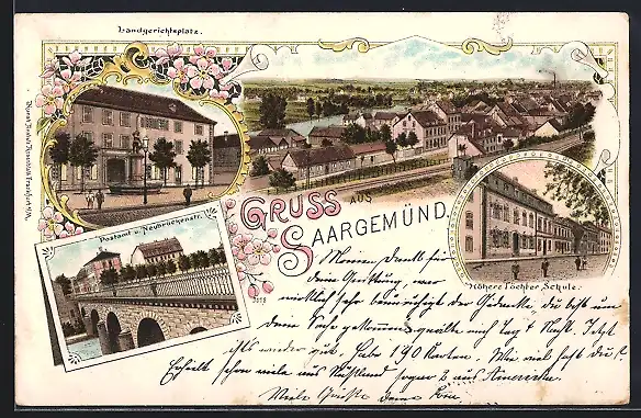 Lithographie Saargemünd, Ortsansicht, Landgerichtsplatz, Post und Neubrückenstrasse