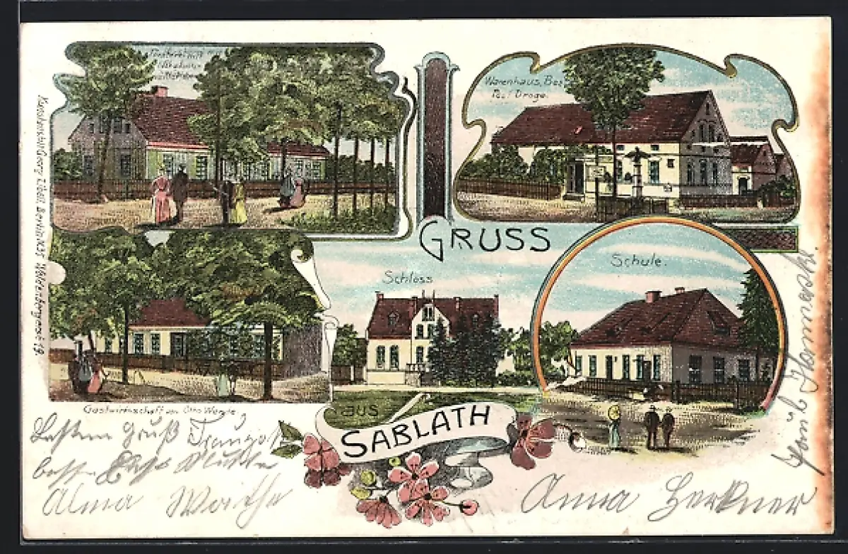 Lithographie Sablath, Gasthaus von Otto Wende, Försterei, Schloss