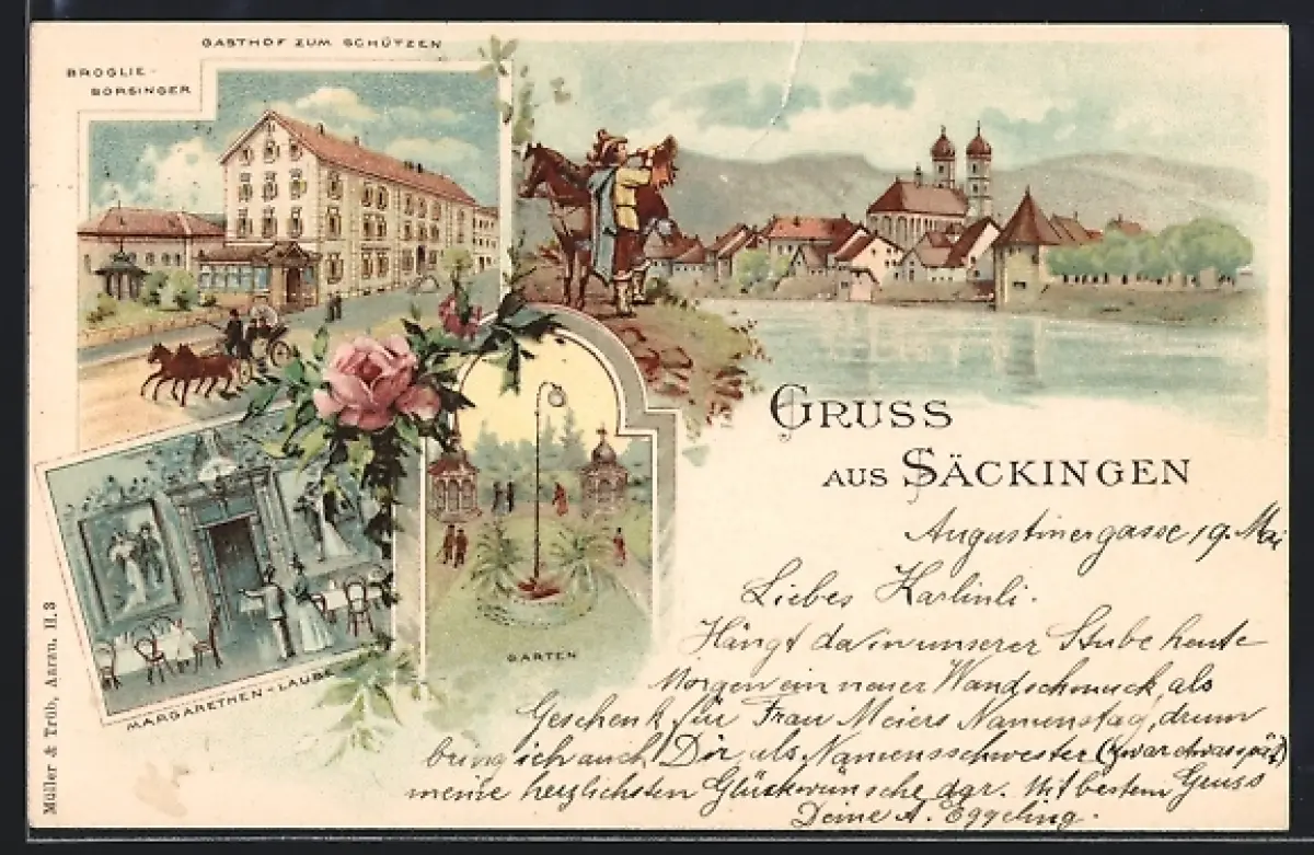 Lithographie Säckingen, Gasthof zum Schützen, Marghareten-Laube, Garten, Rheinansicht mit Kirche