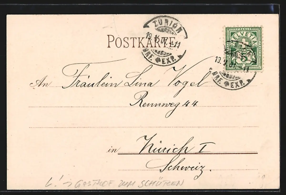 Personenbezogene Daten auf der Rückseite der Karte wurden durch blauen Textmarker unkenntlich gemacht. Die blauen Stellen sind auf die Vorderseite durchgeweicht und wirken sich negativ auf das Postkartenfoto aus