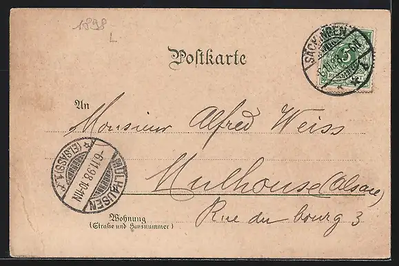 Personenbezogene Daten auf der Rückseite der Karte wurden durch blauen Textmarker unkenntlich gemacht. Die blauen Stellen sind auf die Vorderseite durchgeweicht und wirken sich negativ auf das Postkartenfoto aus
