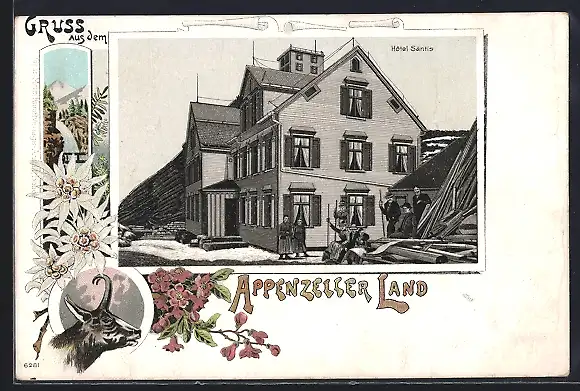 Lithographie Säntis /Appenzeller Land, Partie am Berghotel, Gämse