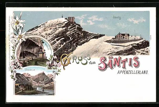 Lithographie Säntis, Gasthaus auf dem Gipfel, Seealpsee