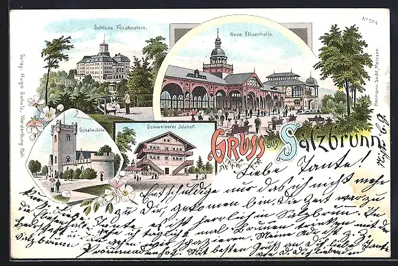 Lithographie Salzbrunn, Neue Elisenhalle, Gasthaus Schweizerei Idahof, Schloss Fürstenstein