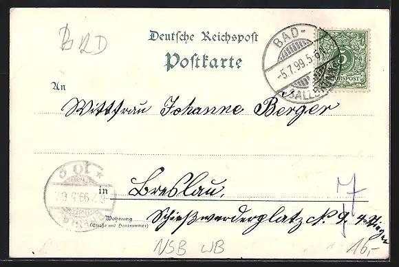 Personenbezogene Daten auf der Rückseite der Karte wurden durch blauen Textmarker unkenntlich gemacht. Die blauen Stellen sind auf die Vorderseite durchgeweicht und wirken sich negativ auf das Postkartenfoto aus
