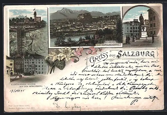 Lithographie Salzburg, Elektrischer Aufzug auf dem Mönchsberg, Mozart Monument