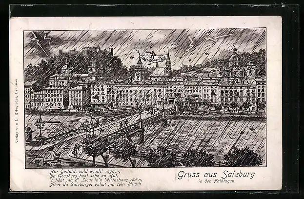 Lithographie Salzburg, Flussansicht im stürmischen Regen