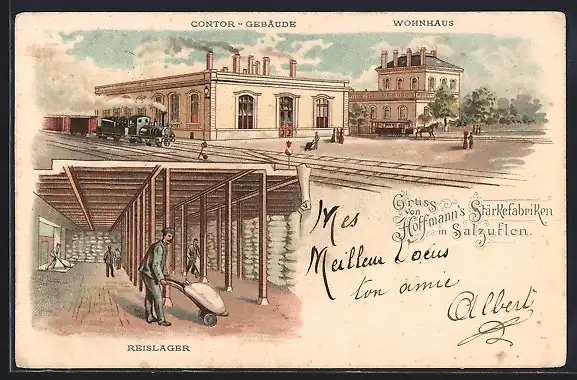 Lithographie Salzuflen, Hoffmann`s Stärkefabriken, Reislager, Wohnhaus, Contor-Gebäude