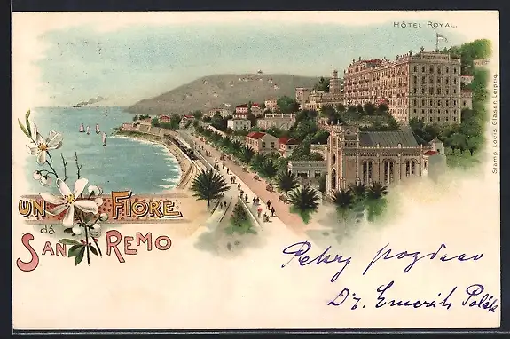 Lithographie San Remo, Hotel Royal mit Küstenpanorama, Segelboote