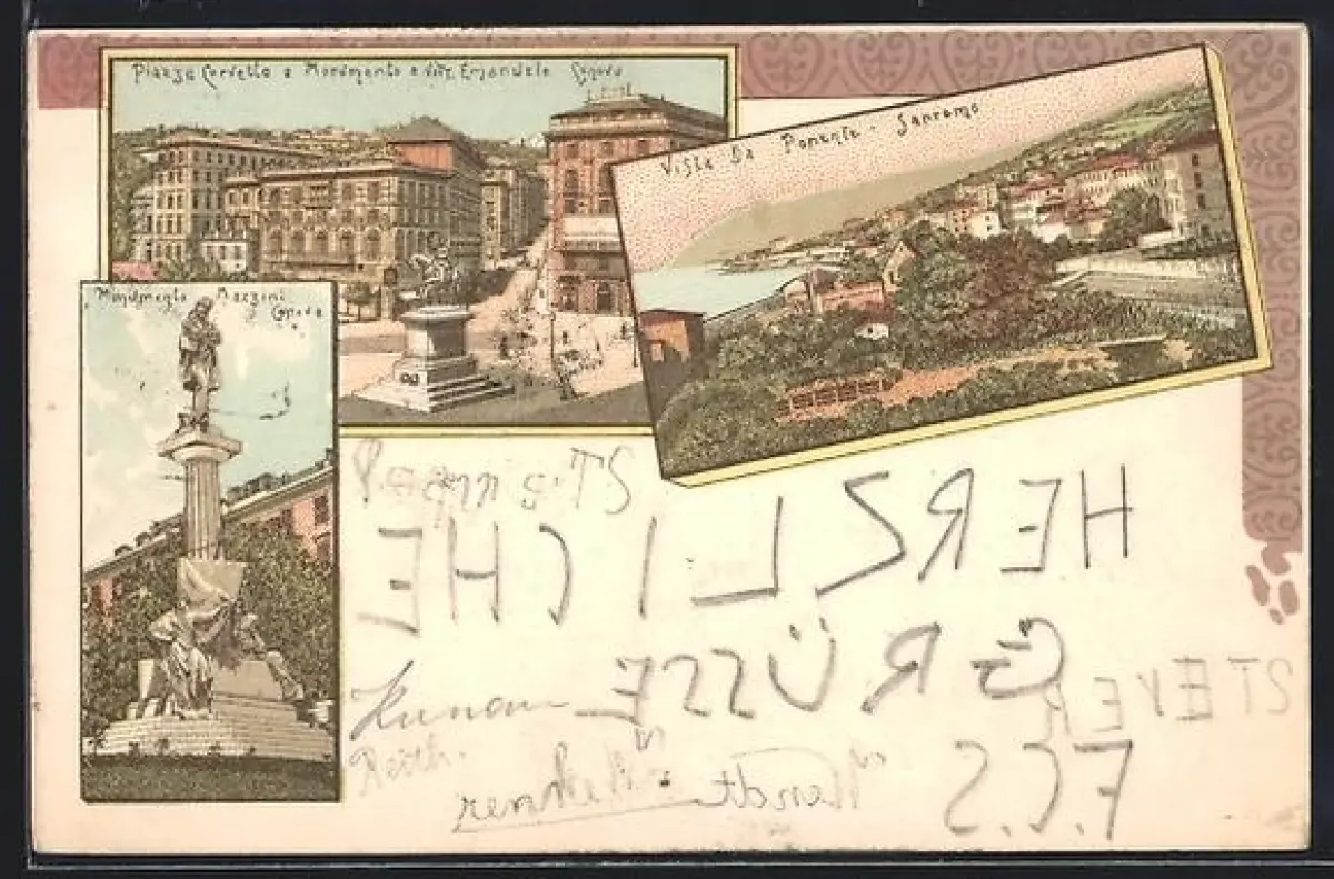 Lithographie Sanremo /Ponente, Monumento Mazzini Gnova, Piazza Corvello e Monumento a Nitt. Emanuele