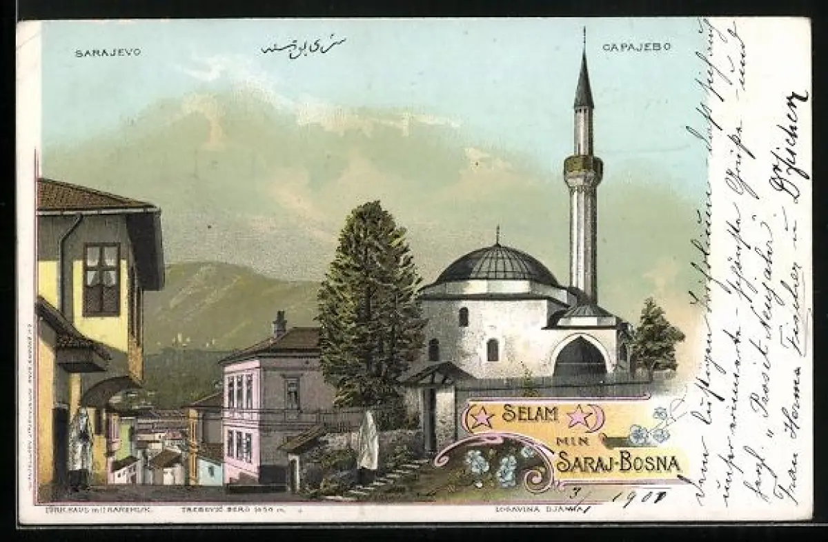 Lithographie Sarajevo, Ortspartie mit Moschee vor Bergkulisse