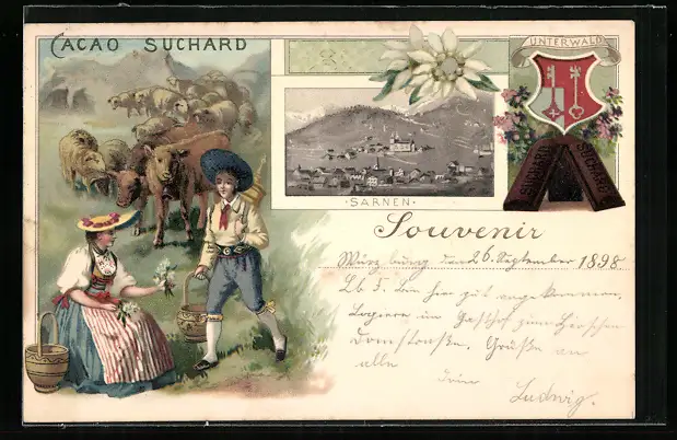Lithographie Sarnen, Reklame für Cacao Suchard, Ortsansicht, Pärchen, Kühe