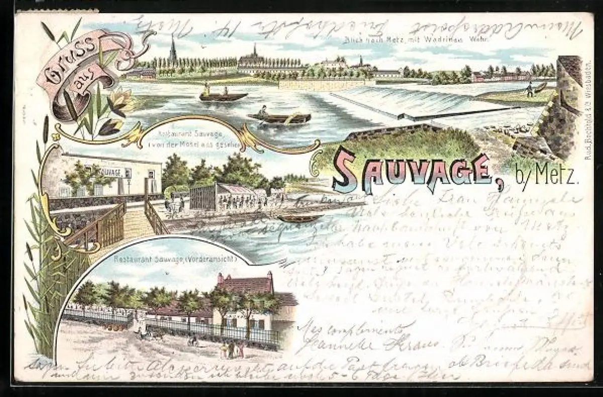 Lithographie Sauvage b. Metz, Restaurant Sauvage von der Mosel aus gesehen, Blick nach Metz