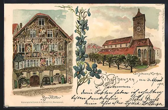 Lithographie Schaffhausen, Ansicht auf Haus Zum Ritter, St. Johanns Kirche