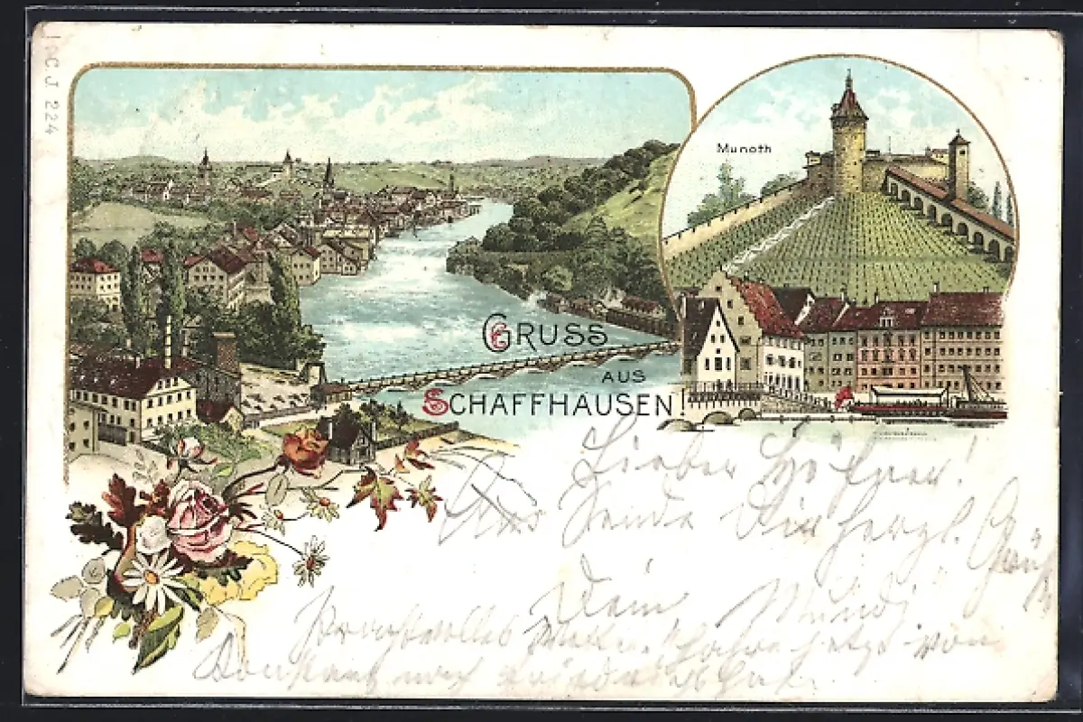 Lithographie Schaffhausen, Ansicht von oben, Munoth, Brücke, Dampfer, Blumen