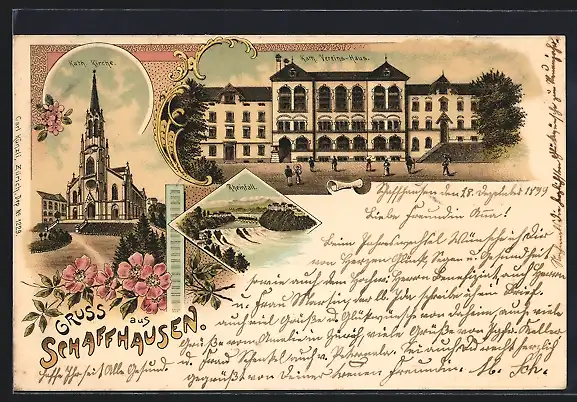 Lithographie Schaffhausen, Kath. Vereins-Haus, Kath. Kirche, Rheinfall