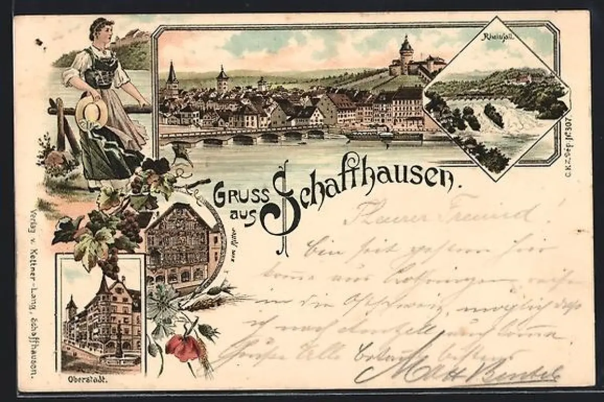 Lithographie Schaffhausen, Oberstadt, Rheinfall, Flusspartie mit Brücke