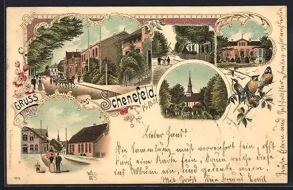 Lithographie Schenefeld / Kiel, Versch. Strassenpartien, Kirche und Blaumeisen
