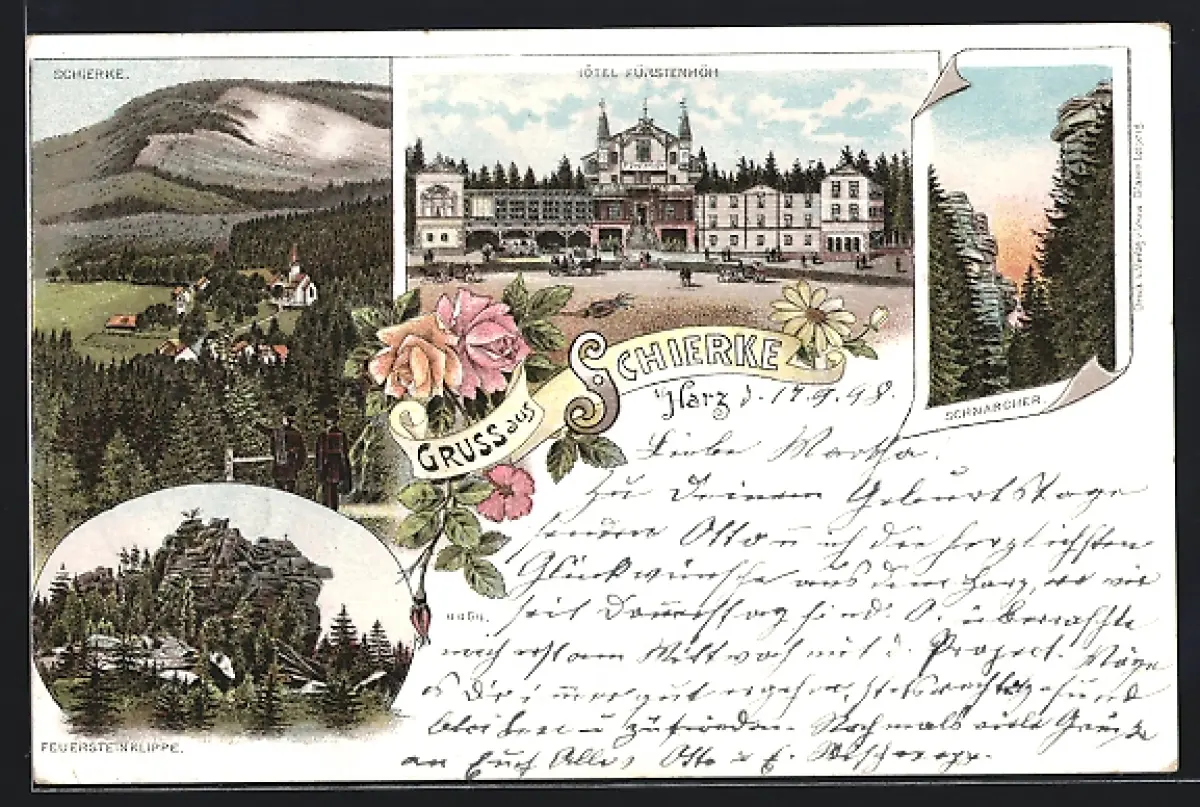 Lithographie Schierke, Hotel Fürstenhöh, Gesamtübersicht, Feuersteinklippe, Schnarcher
