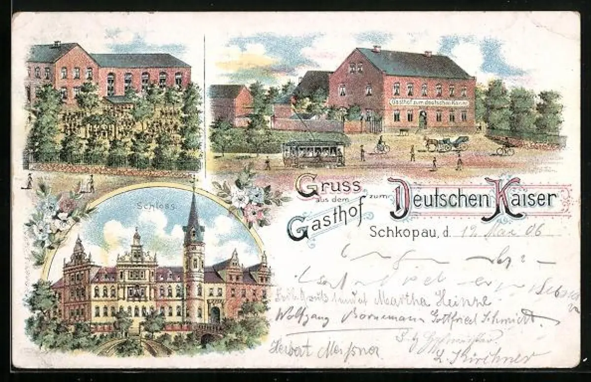 Lithographie Schkopau, Gasthof zum Deutschen Kaiser, Schloss, Strassenbahn