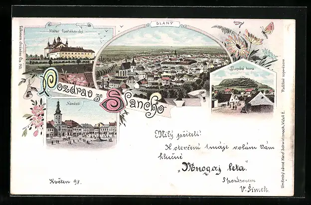 Lithographie Schlan / Slany, Kláster frantiskánský, Námesti, Slanska hora